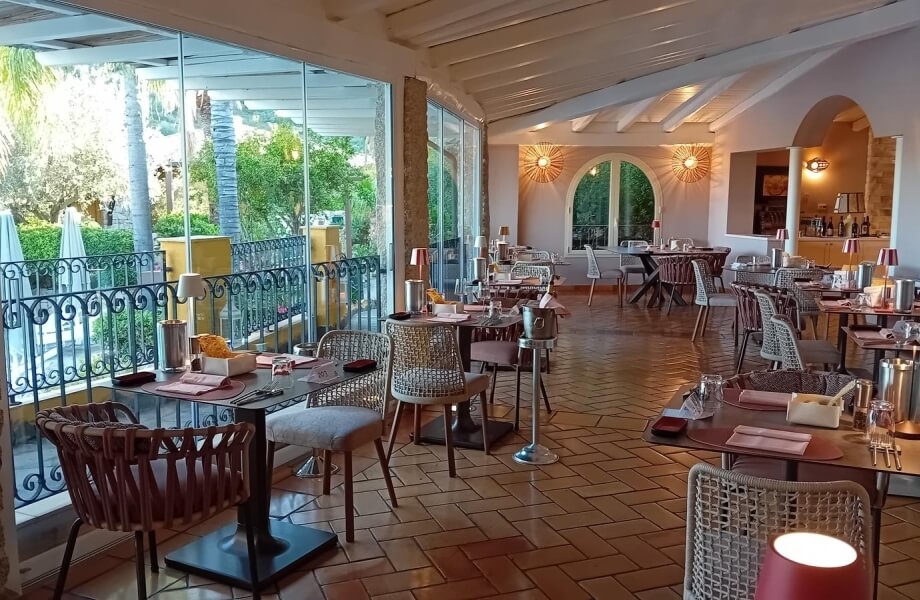 La terrasse du restaurant, lumineuse et protégée par de grandes baies vitrées, offre un cadre élégant pour dîner en toute saison.